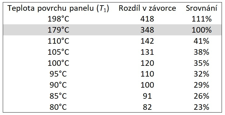 ) . Vliv na zářivý tok je tedy dán pouze rozdílem hodnot v závorce (teplot sálavého a osálaného povrchu). Hodnoty rozdílu byly vyneseny do tabulky níže. Pro teplotu osálaného povrchu (T2) byla uvažována hodnota 293,15 K.