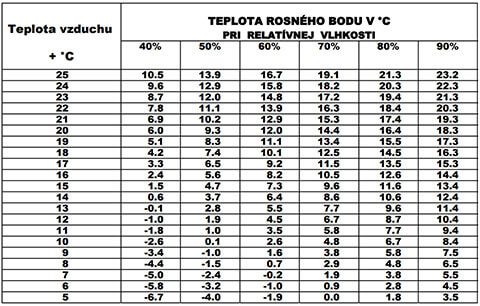 V tabulce níže lze tento děj vidět. Při teplotě 20 °C při relativní 40% vlhkosti bude ke kondenzaci docházet na předmětech s teplotou nižší než 6 °C, naopak bude-li nasycenost vzduchu vlhkostí vyšší (80% relativní vlhkost), pak bude docházet ke kondenzaci vlhkosti na předmětech již s teplotou 16,4 °C. To už mohou být studené zdi i okna.
