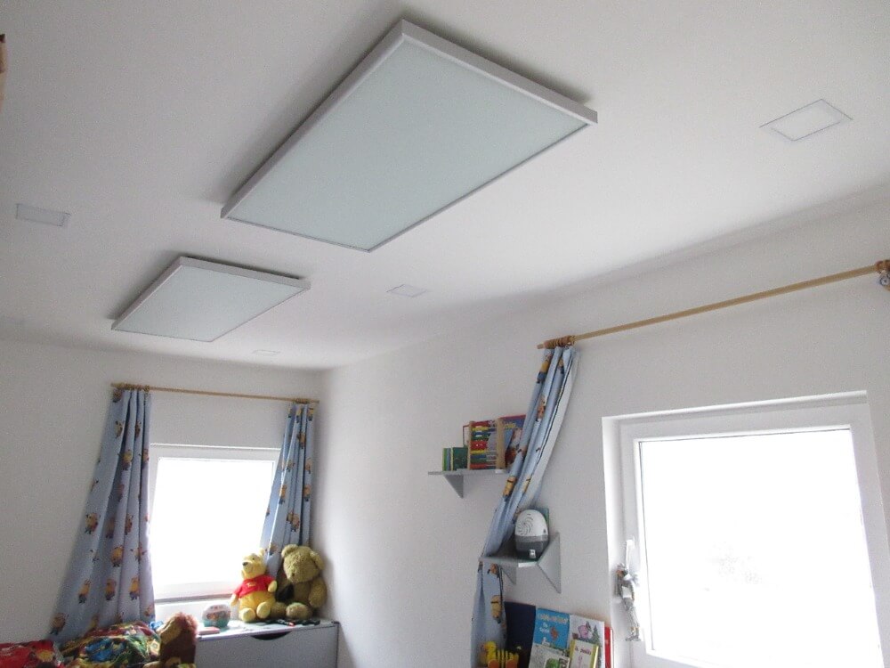 Jsou-li infrapanely umístěny na stropě, pak sálají přímo pod sebe, díky čehož sálají přímo na osoby v místnosti. Dále dochází k ohřevu velké plochy, což umožňuje rovnoměrné prohřátí vzduchu v místnosti. Díky toho je potlačena teplotní stratifikace vzduchu, která se projevuje studeným vzduchem u podlahy a vyhřátým stropem. Potlačení stratifikace vzduchu umožňuje skutečně využít vyrobené teplo a tím snížit spotřebu energie na vytápění. Tento jev je významný zejména v případě vysokých stropů. Při klasickém konvekčním vytápění se destratifikátory používají kupříkladu v halách. Destratifikátory jsou v zásadě ventilátory, které narušují přirozenou cirkulaci vzduchu a promíchávají vzduch v prostoru. Avšak jejich použitím se navyšuje nejen spotřeba elektrické energie, ale také prašnost, tento jev u infrapanelu odpadá.